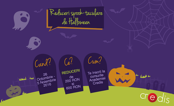 În perioada 26 Octombrie - 5 Noiembrie 2016 înscrie-te la cel putin unul din cursurile Academiei Credis, iar un strigoi îÈ›i va oferi o reducere de 200 lei.